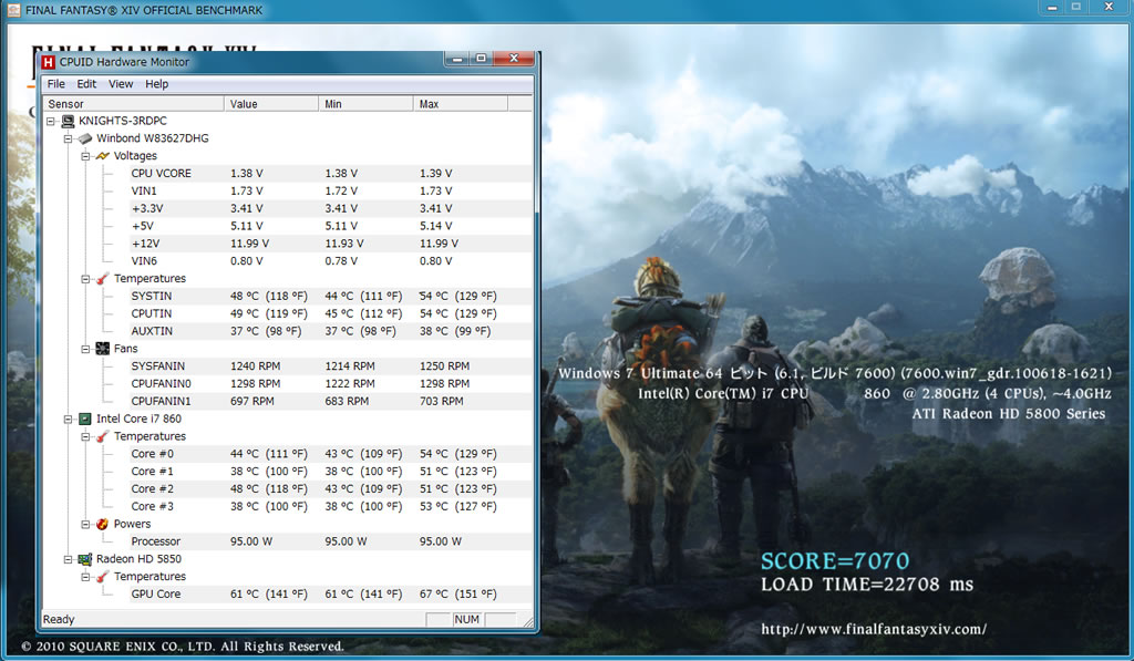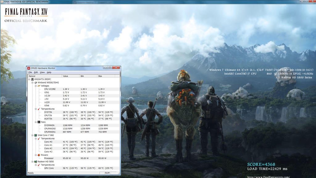 conecoさんのをそのまま引用で申し訳ないけど(´・ω・`) ▼▼▼ PCスペック/環境 ▼▼▼ 【CPU】Core i7 860 4.0GHz@OC(定格2.80GHz) 【GPU MEM】SAPPHIRE TOXIC RADEON HD 5850 1GB GDDR5 PCI-E 【VGAドライバ】ATI Catalyst 10.7 (Display Driver 8.753.0.0(Win7 64)) 【OS】Windows 7 Ultimate 64bit 【マザーボード】ASUS P7P55D-E 【メモリ】Corsair CMX8GX3M4A1333C9 【PCケース】Coolermaster HAF932 【電源】Seasonic SS-600HM 【HDD/SSD】Intel SSDSA2M080G2GC 【サウンド】オンボード 【CPUクーラー】NH-D14 【モニター】BenQ M2700HD ☆ システム内容 ☆ さて、肝心のテスト結果ですが・・・ ▼▼▼ テスト結果 ▼▼▼ 【LOWモード スコア】7070 【LOWモード ランク】OVER7000L 【HIGHモード スコア】4368 【HIGHモード ランク】OVER3000H 【CPU温度】38~54℃ 【GPU温度】58~69℃ ☆ Lowテスト結果 ☆ ☆ Highテスト結果 ☆ とりあえず一言・・・ うぇwwwなんだこれwwうぇww 恐ろしいまでに結果が伸びてないww Lowですら8kいかないとか・・・ね・・・(´・ω・`) なんか、こんな結果見ると、HD5850でCFXでIYH!!!!!!とかしたくなってくるorz けど、今は我慢時なのです(´・ω・`) PR